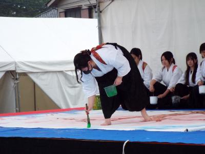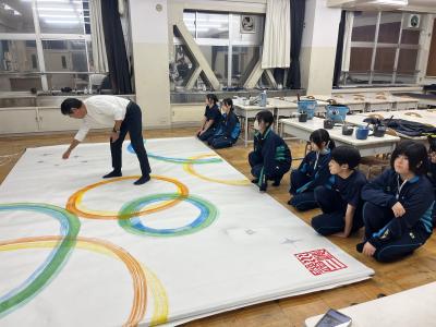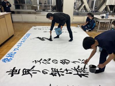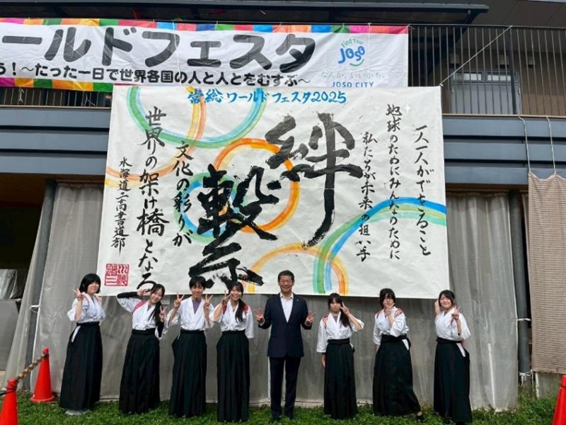 様々な国の人が住む常総市で共生をテーマにしたイベントが行われました。国籍に関係なく人と人との繋がりを大切にしたいという想いを込めて揮毫しました。常総市長神達他岳志氏との共同パフォーマンスで、生徒たちにとって大変良い思い出になりました。