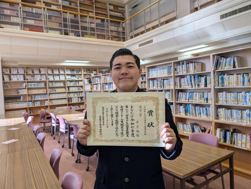 令和7年度「第71回青少年読書感想文全国コンクール茨城県予選」で、本校生 平井裕雅 さんの作品が「優良賞」に選ばれました。平井さんは、『人間失格』(太宰治)を読んで、自分を演じる主人公もSNSで自己演出をする現代の人々も同じなのではないか、ということに気づき、考察しました。